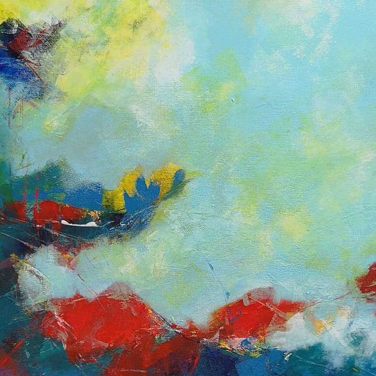 Een globale impressie van het schilderij "Ontmoeting met rood" 80x80cm.
