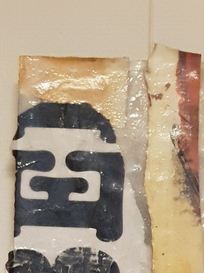 Op elkaar geplakte delen zorgen voor vlak verdelingen die toevalligerwijs in elkaar overlopen of wegblenden in het geheel. Als vernislaag is houtlijm gebruikt. Dit krijgt een transparante werking en zorgt voor een duurzame beschermlaag. (Papier/hout en houtlijm op aluminium).