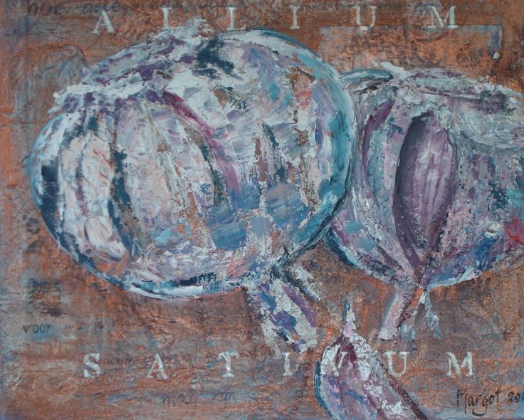Allium Sativum is de latijnse naam voor Knoflook. De mooie vorm en kleuren inspireerden mij om dit op het doek te zetten. De oranje ondergrond is in werkelijkheid bronskleur, de letters zilver.