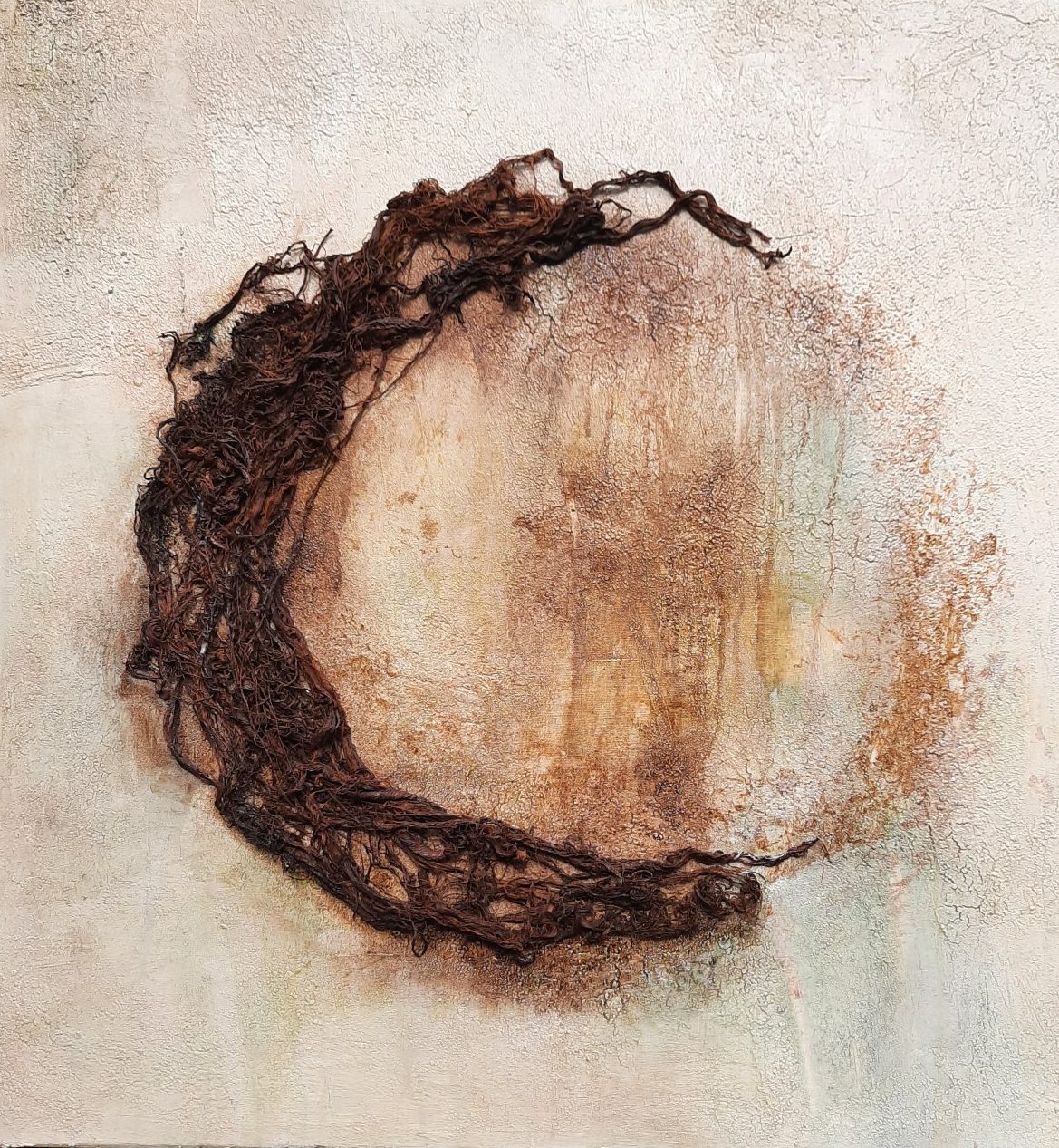 Lichte structuren als ondergrond en zachte mooie aardetinten . Acryl en bister op doek.