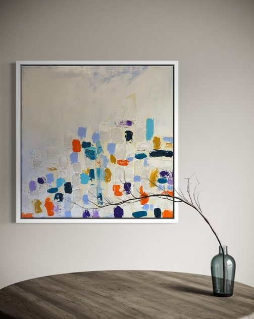 Mixed media, acryl en structuur op 70×70 cm doek.